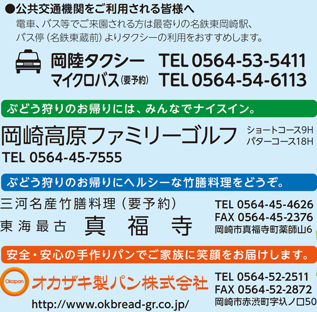 ぶどう狩りは、ご家族でしたら予約は要りませんが、混雑する祝祭日は駐車場がなくなり入園できない場合もございます。20名様以上の団体様や、バーベキューは完全予約制ですので、必ず予約が必要です。7軒の農家のどこかくに直接予約するか、組合の代表に電話やFAXでご予約してください。バーベキュー場は場所に限りがございます。場合によってお断りする場合もございます。